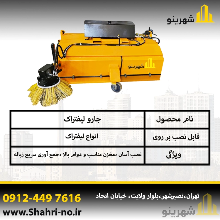 جارو لیفتراک یا سوییپر لیفتراک یا سوییپر صنعتی لیفتراک یکی از انواع جلوبندهای نظافتی است که روی شاخک یا دکل لیفتراک نصب میشود و برای تمیز کردن محیطهای صنعتی، انبارها، کارخانجات، سولهها، و فضاهای باز کاربرد دارد. با نصب این جلوبند، لیفتراک بهراحتی تبدیل به یک دستگاه جاروکننده صنعتی قدرتمند میشود.